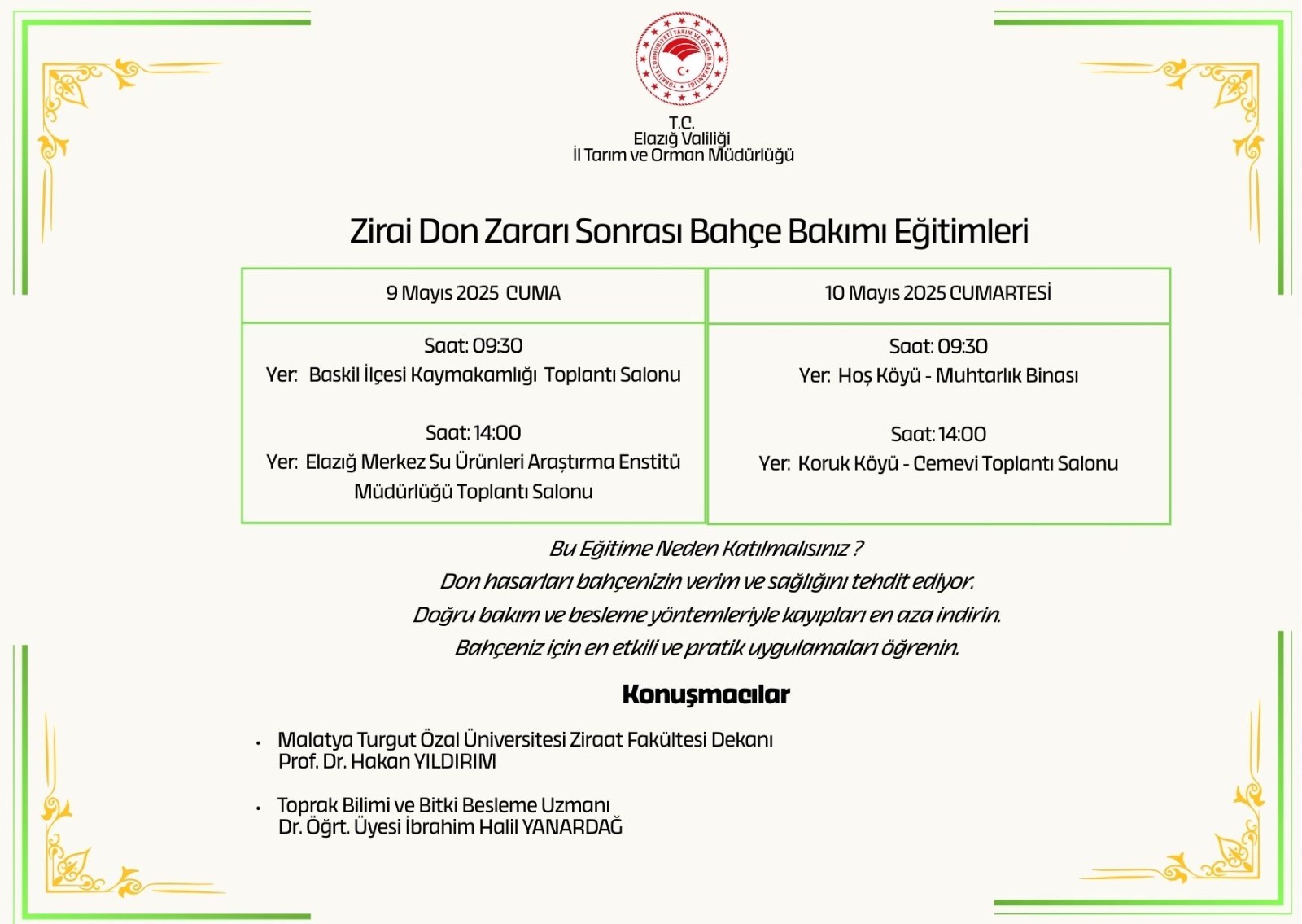 Elazığ Valiliği İl Tarım ve Orman Müdürlüğü tarafından düzenlenen “Zirai Don Zararı Sonrası Bahçe Bakımı Eğitimleri” kapsamında, don hasarlarının meyve bahçelerinde neden olduğu verim ve sağlık kayıplarını azaltmaya yönelik eğitim faaliyetleri gerçekleştirilecektir. Eğitimlerde, don sonrası yapılması gereken bakım ve besleme uygulamaları hakkında bilimsel ve pratik bilgiler ...